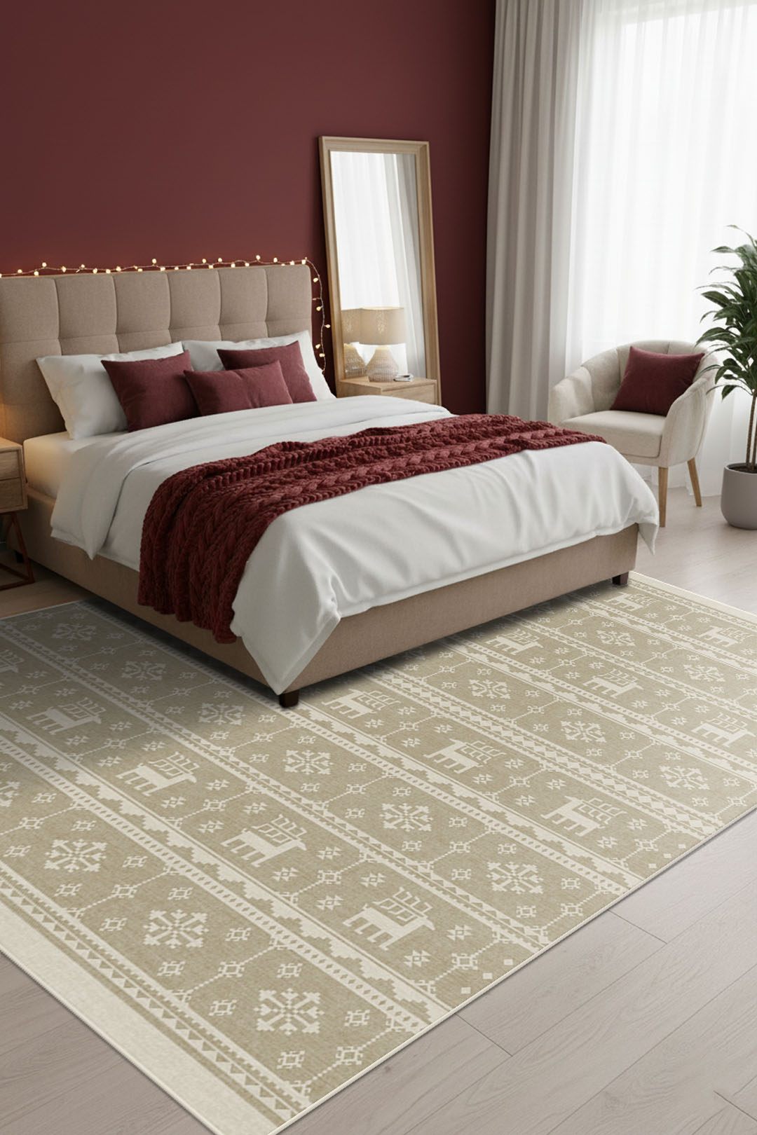 Wähle den passenden Teppich für dein Schlafzimmer und lass dein Bett im Mittelpunkt stehen.